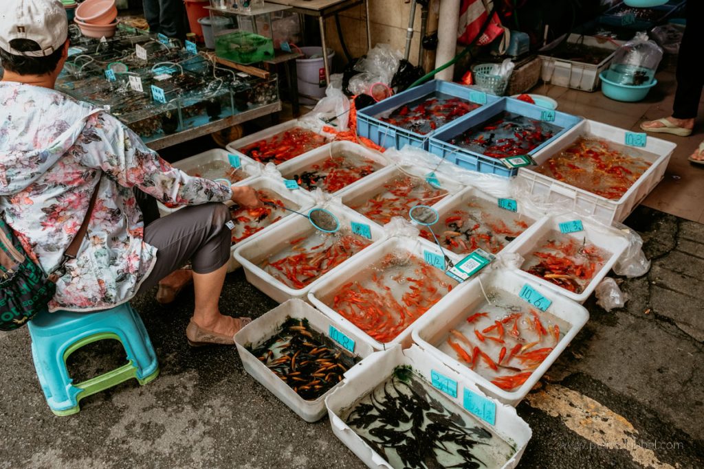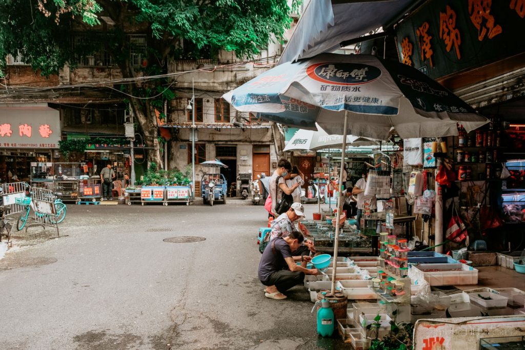 Wenn man jedoch ein Stück weiter durch die Marktgassen geht, verändert sich das Bild. Hinter dem Bereich mit Heilkräutern beginnt ein Abschnitt, in dem hauptsächlich Haustiere verkauft werden. In großen Becken schwimmen Fische und Aale, daneben sieht man Schildkröten, Frösche und andere Wassertiere sowie Kleintiere. An einigen Ständen werden auch Babykatzen, Hundewelpen oder Ziervögel angeboten. Dieser Teil des Marktes zeigt eine Seite des alltäglichen Lebens in Südchina, wo Märkte traditionell nicht nur Lebensmittel, sondern auch lebende Tiere anbieten.
