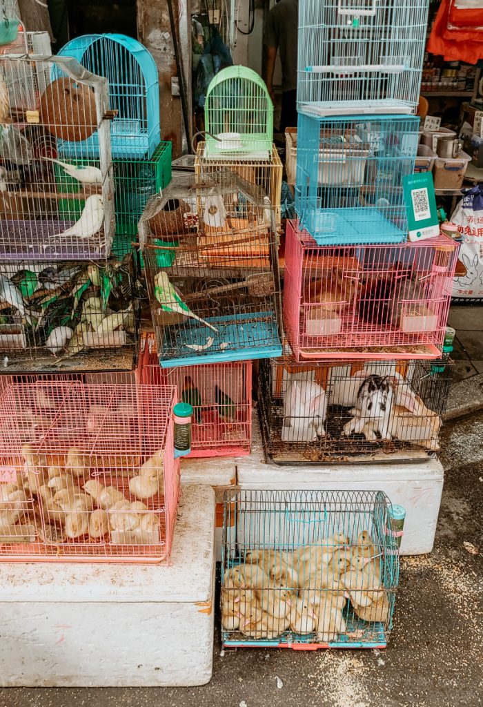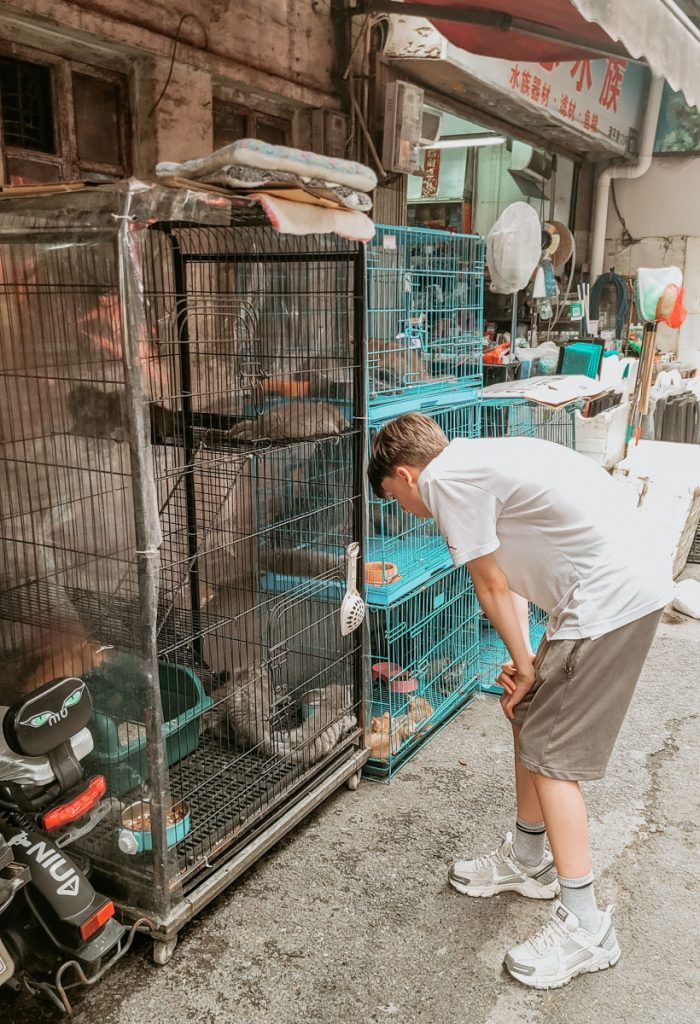 Extra Hinweis: Für uns westliche Besucher wirkt es definitiv befremdlich, wenn niedliche Haustiere in winzige Käfige gesperrt werden. In Guangzhou habe ich sogar ein Streichelcafé mit Alpakas gesehen, die nachts im Schaufenster schlafen mussten. Katzen-Streichelcafés sind in ganz China ebenfalls sehr beliebt. Nach wie vor gibt es in China kein umfassendes nationales Tierschutzgesetz. Nach der Corona-Pandemie wurde der Handel und Konsum vieler Wildtiere jedoch landesweit verboten. Das Thema ist komplex und ich kenne mich zu wenig damit aus, um euch konkrete Informationen zu geben. Hier habe ich jedoch einen interessanten Artikel zum Haustier-Boom in China gefunden.