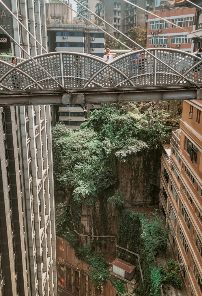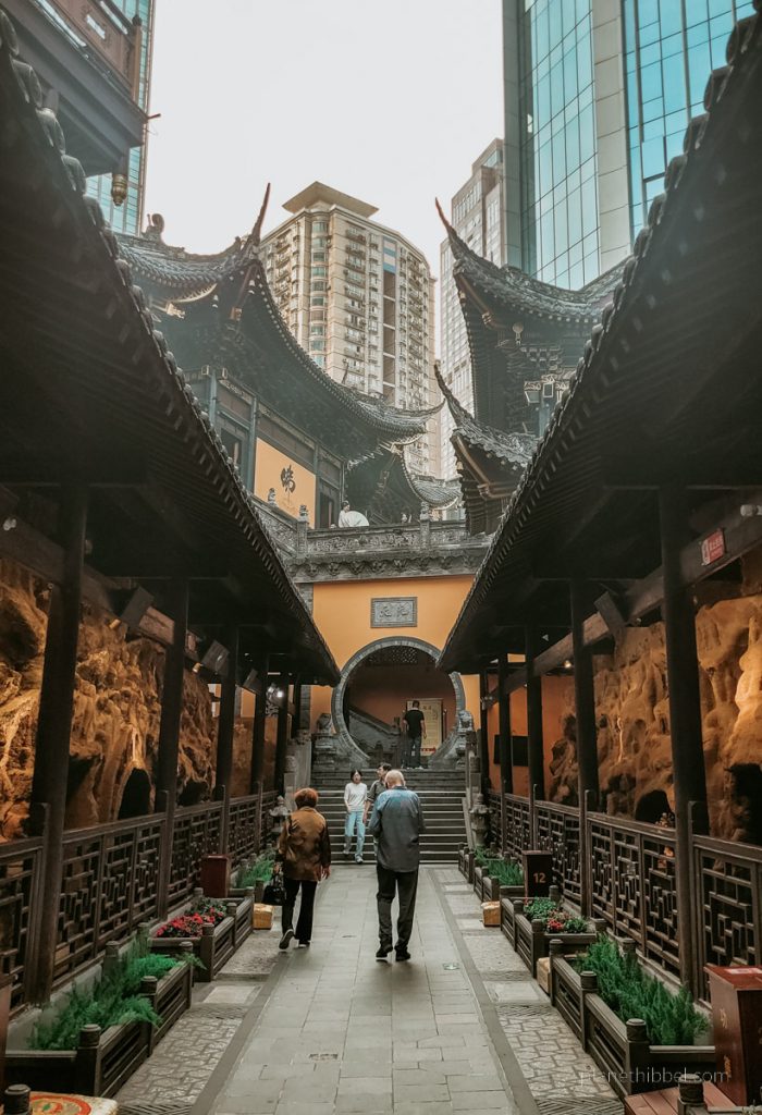 Das bemerkt man jedoch erst, wenn man über die Balustrade schaut oder plötzlich eine Brücke überqueren muss. Darunter rauscht dann die Megacity in schwindelerregender Tiefe vorbei: Straßen voller hupender Autos, winzige Menschen, die wie Ameisen wirken, und die unzähligen Stockwerke anderer Hochhäuser. Fotos davon zu machen, ist schwierig. Man muss diese verrückte Architektur wohl einfach auf sich wirken lassen. Doch zwischen all dem Beton, Glas und Neon findet man auch immer wieder kleine grüne Oasen: Parks, Tempel, Teehäuser und kleine Garküchen. Chongqing ist einfach eine Stadt der absoluten Kontraste.