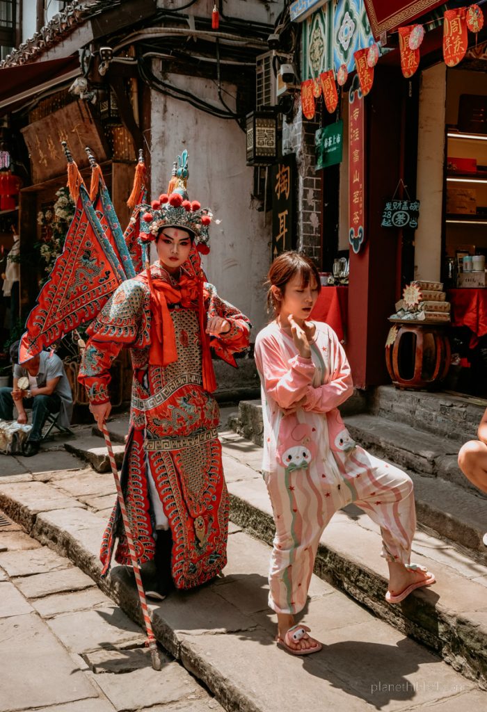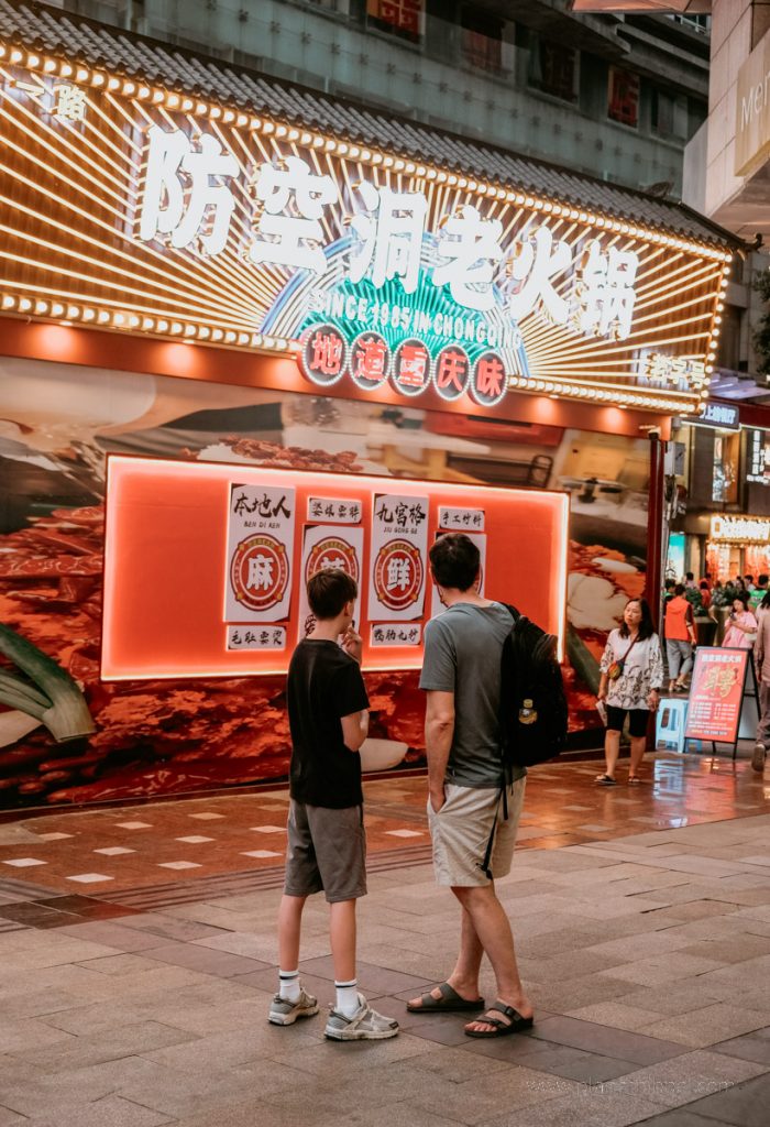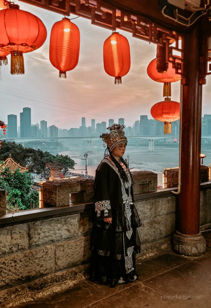 Drinnen ist es wild, chaotisch und schrill und manchmal fast zu viel für unser deutsches Gemüt – aber genau dieses „Zu viel“ ist typisch für Chongqing. Es gibt endlose Gassen voller Streetfood-Stände, Karaoke-Bars, die bis tief in die Nacht lärmen, und kleine Läden mit Souvenirs, die zwischen Kitsch und Kunst schwanken. Von den oberen Etagen blickt man direkt auf den Zusammenfluss von Jangtse und Jialing – ein Panorama, das genauso surreal ist wie die Stadt selbst.