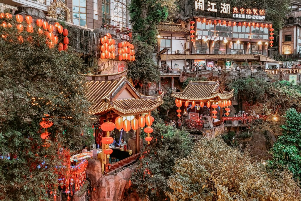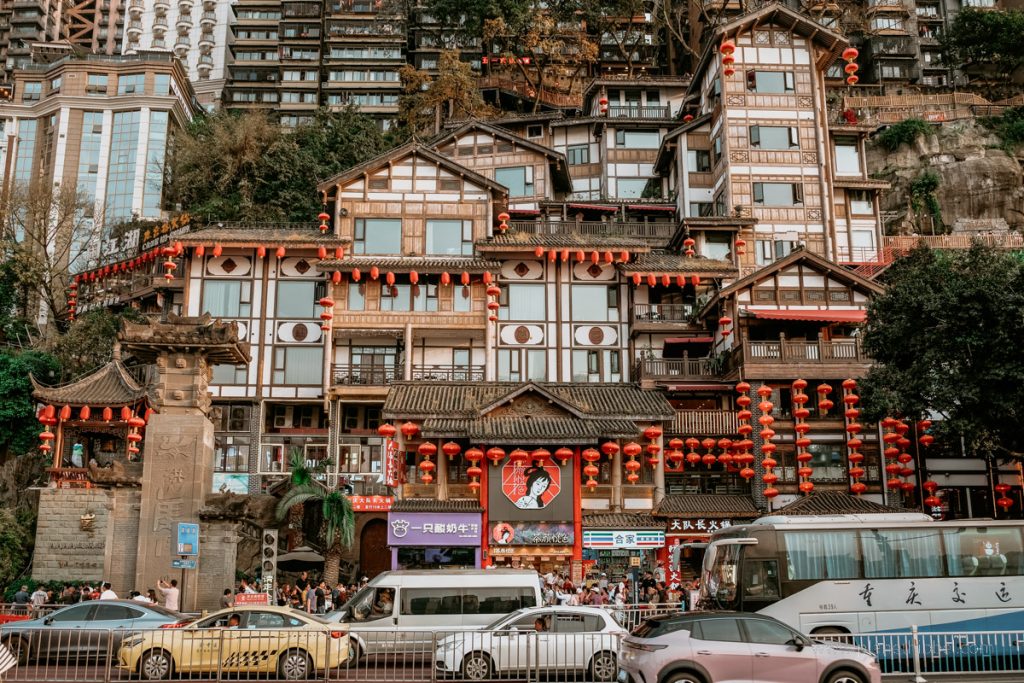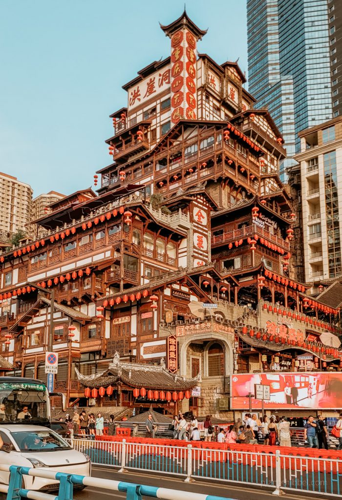 Hongyadong ist ein elfstöckiges Holzbauwerk, das in die steilen Felsen über dem Jangtse hineingebaut wurde. Es zählt zu den skurrilsten Bauwerken Chongqings und ist daher ein echter Touristenmagnet. Tagsüber ähnelt es einer riesigen Pfahlbausiedlung im Stil der traditionellen Diaojiaolou-Architektur, die einst typisch für Südchina war. Nachts hingegen verwandelt es sich in ein flackerndes Lichtermeer und wirkt wie eine pulsierende Filmkulisse. Nicht umsonst wird Hongyadong oft mit der Geisterstadt aus Hayao Miyazakis „Chihiros Reise ins Zauberland“ verglichen.