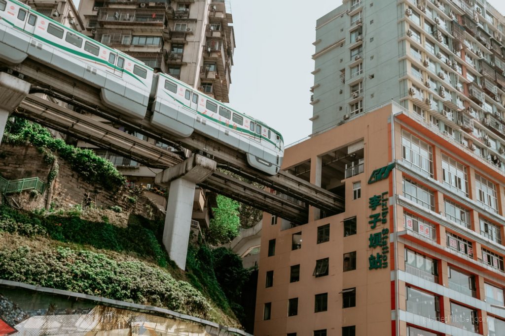 Besonders eindrucksvoll erlebt man Chongqings schräge Architektur am Liziba-Bahnhof. Hier fährt die Linie 2 der Metro nämlich mitten durch ein Hochhaus! Für die Bewohner:innen des Hochhauses sind die Züge längst Alltag, für Besucher:innen ist es jedoch ein skurriler Wow-Moment. Die Bahn rauscht nämlich auf der Höhe der sechsten bis achten Etage durch das 19-stöckige Gebäude. Von einer kleinen Aussichtsplattform direkt neben den Gleisen kann man die Bahn durch das Haus donnern sehen. Noch eindrucksvoller ist es jedoch, das Spektakel von der Straße aus zu sehen. Diesen Anblick teilt man sich allerdings mit unzähligen anderen Touristen.