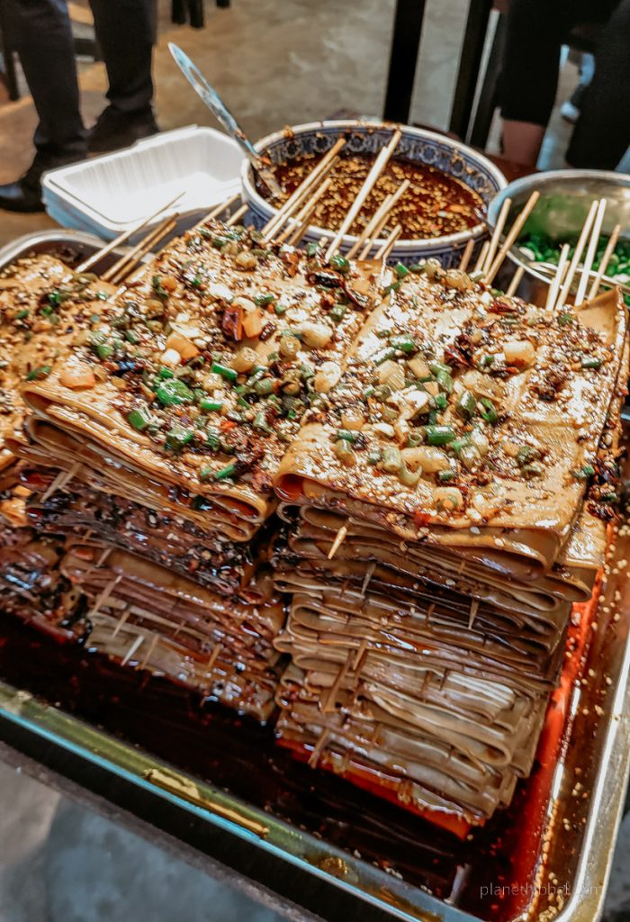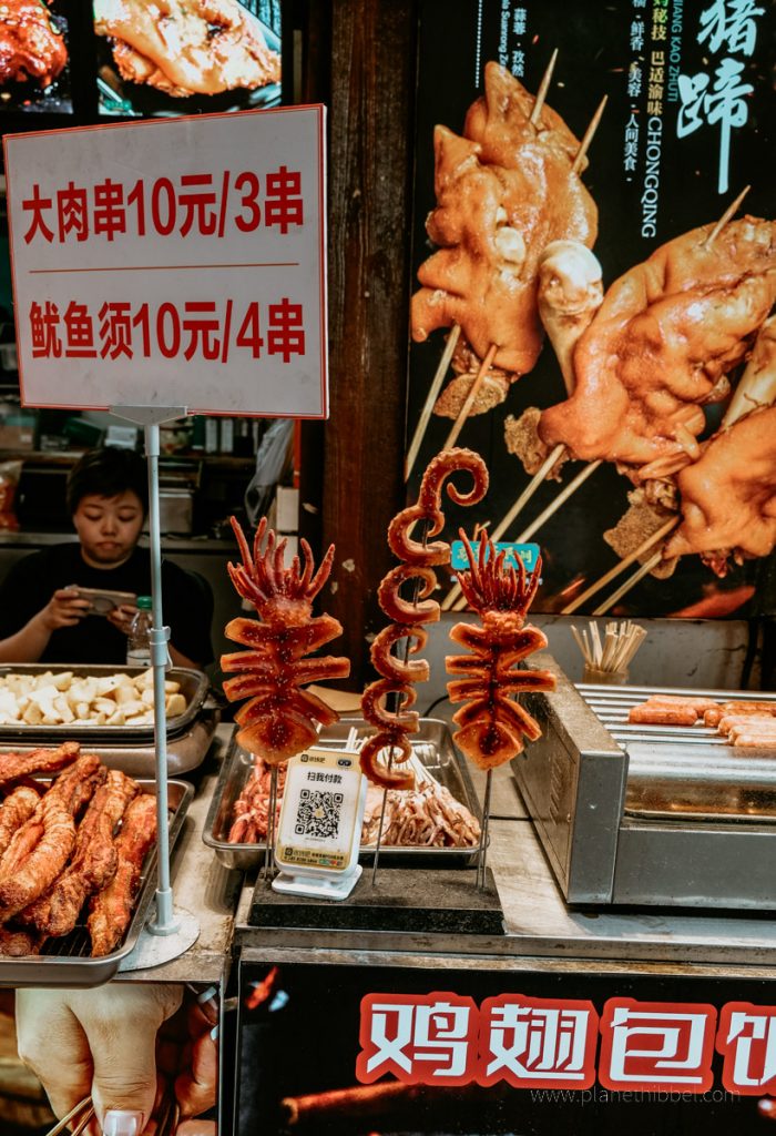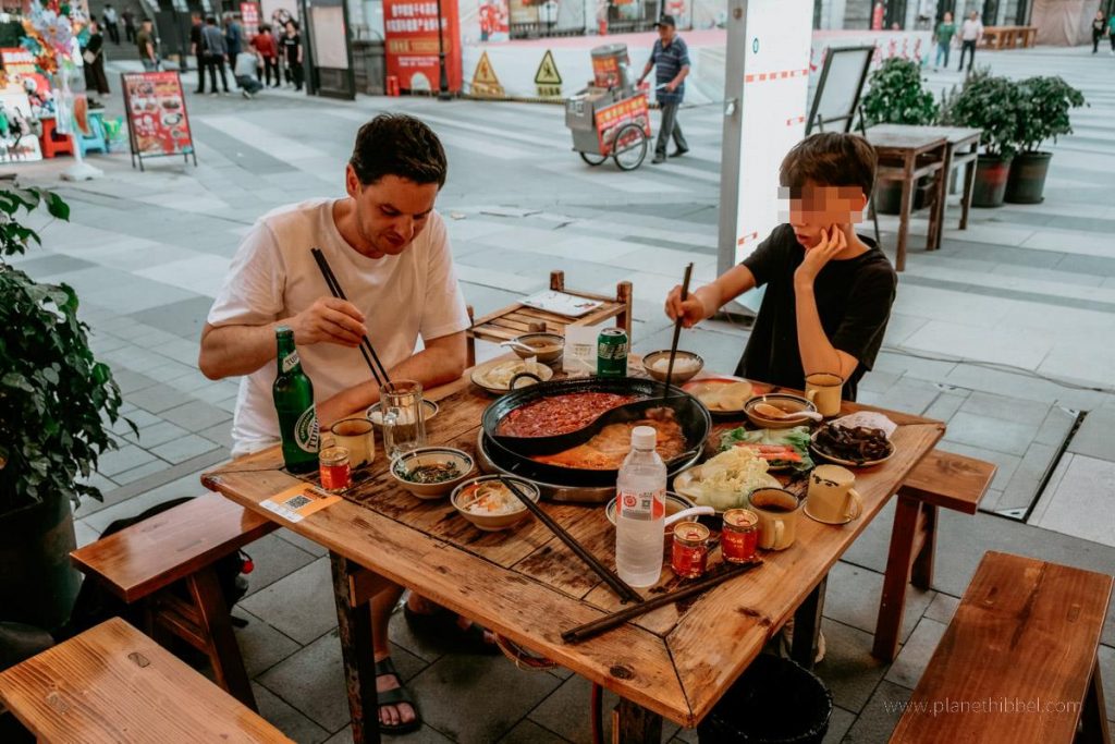 Chongqing ist DAS Zentrum des chinesischen Hotpots und man bekommt ihn quasi an jeder Straßenecke. Hotpot bedeutet, dass in der Mitte des Tisches ein brodelnder Topf steht, gefüllt mit Brühe, Chilis, Pfeffer und Gewürzen. Darin gart man Gemüse, Fleisch, Tofu, Nudeln oder gerne auch mal Innereien oder Hühnerkrallen. Die Chongqing-Variante ist legendär scharf. Schon der Duft der roten Brühe mit unzähligen Chilis und Szechuan-Pfefferkörnern bringt einen ins Schwitzen. Es gibt zwar auch mildere Varianten, aber auch die rauben einem mitunter die Sinne.