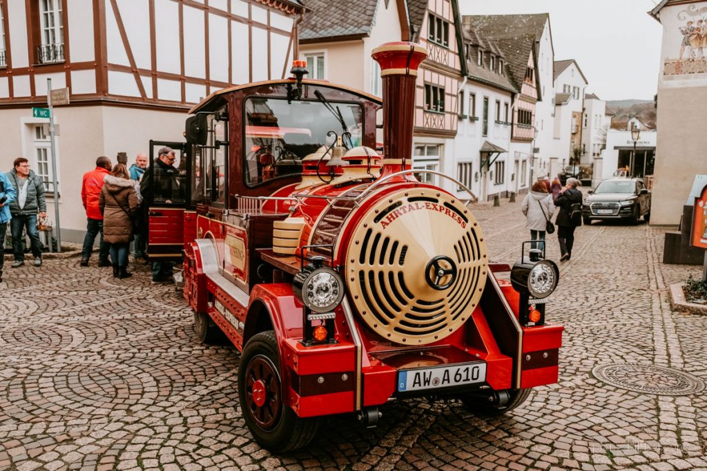 Auf keinen Fall verpassen sollte man Ahrweiler, einen der schönsten Orte im Ahrtal. Um dorthin zu gelangen, kann man die drei Kilometer von Bad Neuenahr-Ahrweiler entweder zu Fuß gehen, mit dem Auto fahren oder die öffentlichen Verkehrsmittel nutzen. Deutlich charmanter ist es jedoch, den Ahrtal Express zu nehmen, der regelmäßig zwischen den beiden Orten verkehrt. Der Name „Express” ist hier jedoch etwas irreführend, denn es handelt sich um eine kleine nostalgische Bimmelbahn, die gemächlich durch die Landschaft tuckert ;).