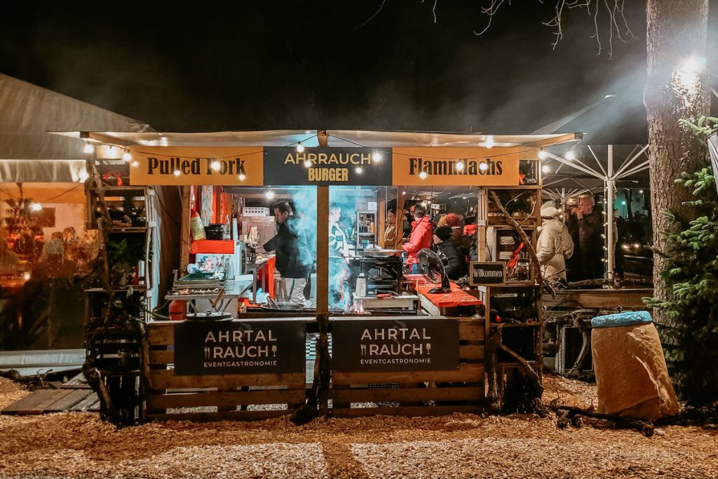 An den zahlreichen Ständen duftet es nach weihnachtlichen Leckereien und Glühwein, der ausschließlich aus Ahr-Weinen hergestellt wird. Und natürlich findet man hier auch Dekoratives oder das eine oder andere Geschenk für seine Lieben. Direkt am Ufer der Ahr gibt es zudem eine coole Beachbar, in der man im Winter auf Strandstühlen seinen heißen Grog schlürfen und sich an Feuerstellen wärmen kann.