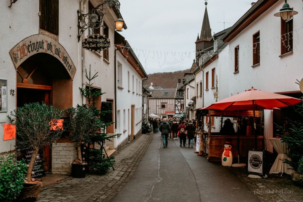 Auf dem Marktplatz findet ein gemütlicher Weihnachtsmarkt statt, wo Winzer ihren typischen Ahrtal-Glühwein ausschenken und Kunsthandwerker winterliche Kleinigkeiten anbieten. Wir fühlten uns glatt in eine weihnachtliche Schneekugel gebeamt.
